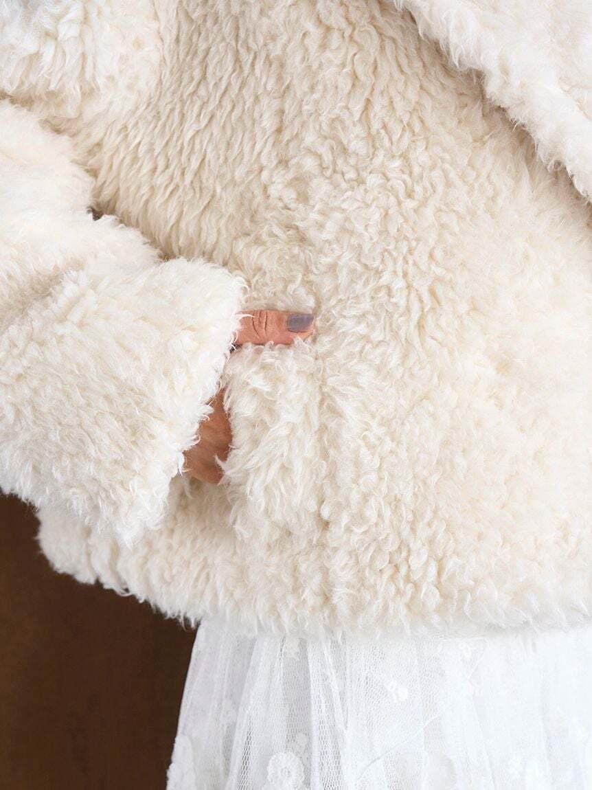 たっぷりとしたボリュームとリッチな起毛感が魅力のフェイクファーを使用したゴージャスなボアショートコートです。