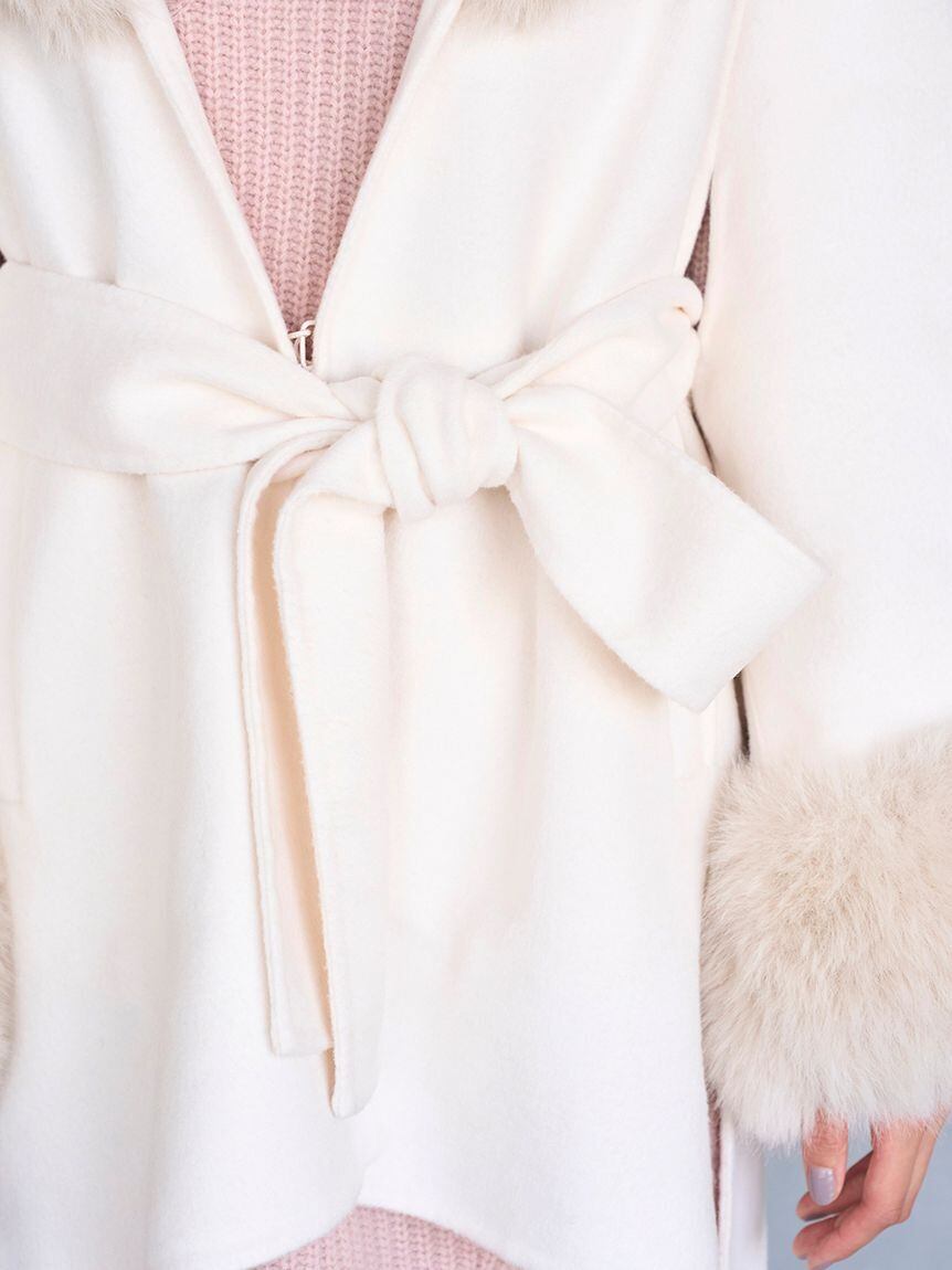 襟ぐりと袖口にあしらわれたボリューミーなエコファーがゴージャスなAラインのファーコートです。
