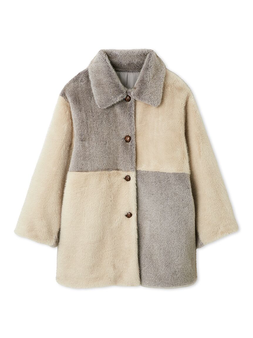 程よい毛足の長さで差し毛がある、よりリアルに近いエコファー素材を使用し、微配色のパッチワークで表現したミドル丈のコート。