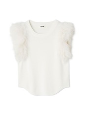 毛足が長くふわふわしたファーがあしらわれたノースリニット。
