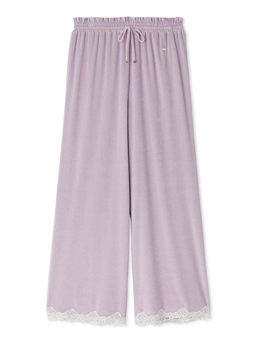 作中に描かれたリリーをオリジナルのレースに仕立てて裾にあしらった、ヴィンテージライクなベロア素材のロングパンツです。