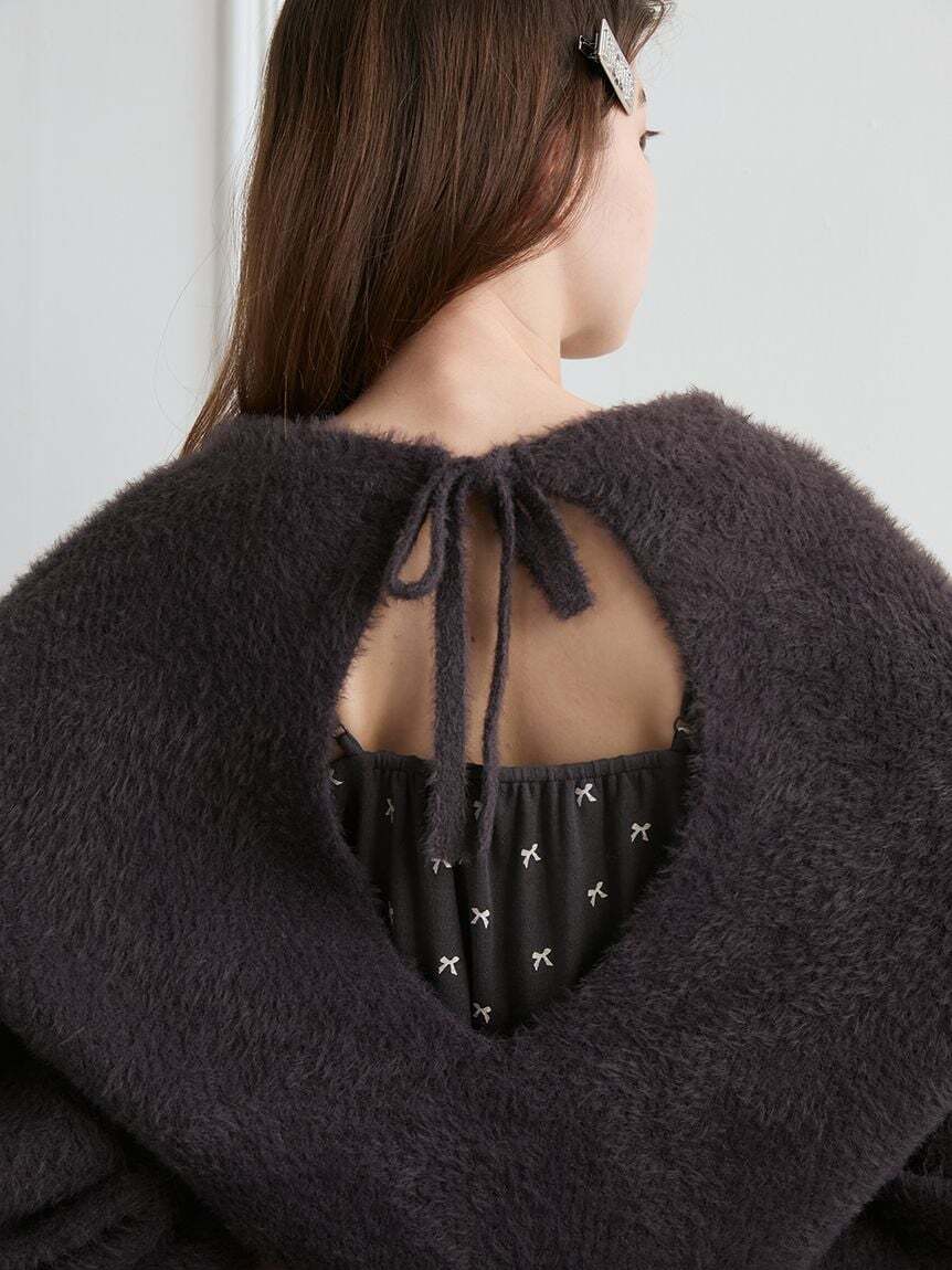 背中側はリボン結びで大きく開いているので着脱しやすく、1枚で可愛く着こなせるデザインです。