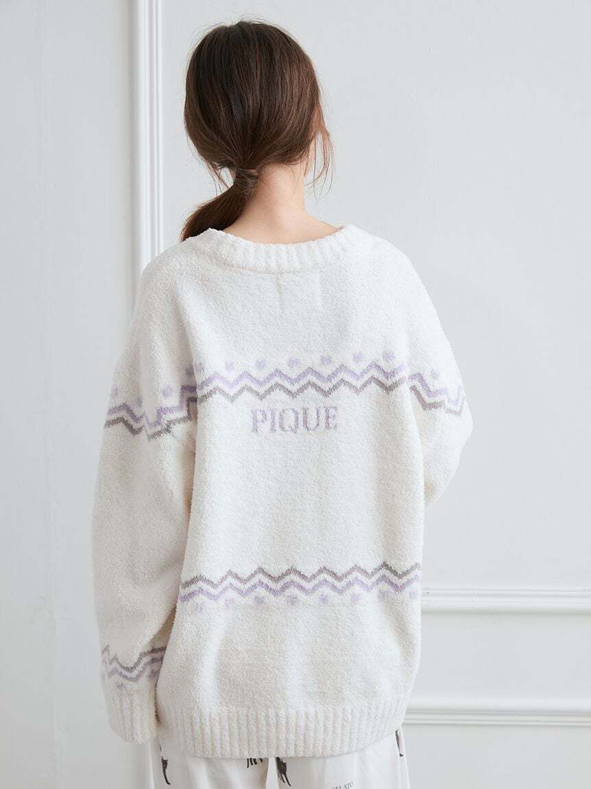 温かみのあるノルディック柄の中に、ファーの黒猫とハート、PIQUEロゴを大胆にデザインしたジャガードプルオーバーです。