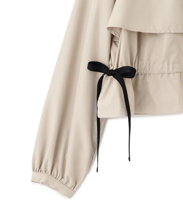 配色リボンでメリハリを付けたフード付きペプラムジャケット。