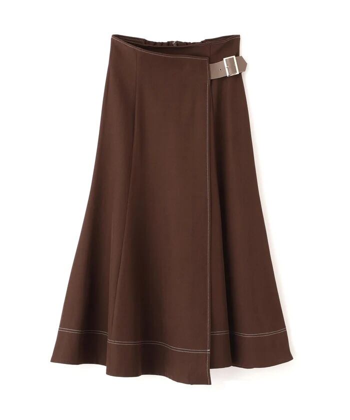 バイカラーのステッチを効かせたラップ風デザインのミディ丈スカート。