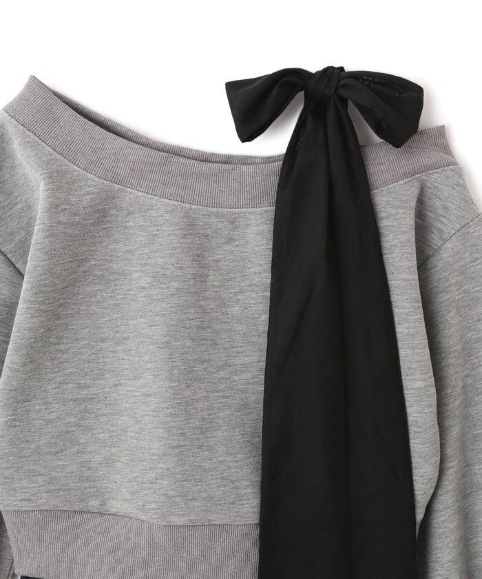 肩見せデザインに大きなリボンをあしらったガーリーなスウェットセットアップ。