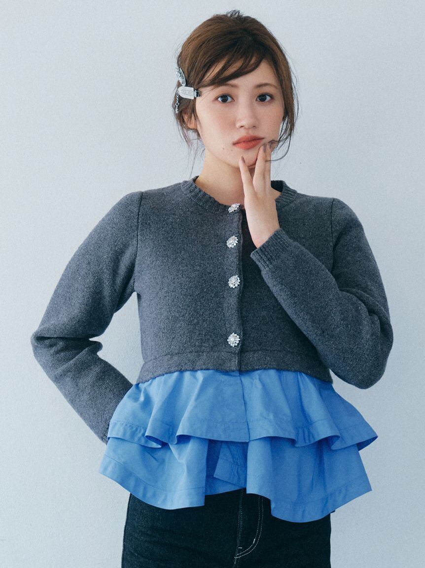 ランダムヘムのペプラムがレイヤードされたカーディガン。
